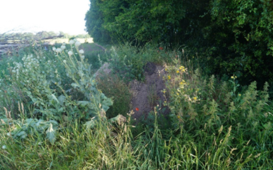 Her er et eksempel på en jordbunke. Den er delvist groet til, men der er stadig bare pletter, hvor bier kan lave bo.