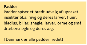 Der vil hurtigt indfinde sig insekter, som ligger æg i vandet. Insektlarver er fødegrundlag for padderne, derefter vil padderne indfinde sig. Padder flytter sig især meget i marts-maj. De første arter man kan holde øje med, er lille vandsalamander, skrubtudse, grøn frø og butsnudet frø.