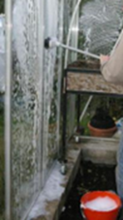 Afvaskningen af drivhuset foregår bedst på en mild dag, hvor hænderne ikke fryser helt af.