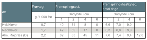 Kløvergræs skal sås i en sådybde på 1 cm, hvilket i øvrigt også gælder for blandinger med lucerne. Herunder behandles kløver og lucerne under en fællesbetegnelse, da mange af kriterierne går igen. Desværre ser vi ofte, at sådybden ender med at blive for stor, da man ved optimal sådybde kan opleve at se græsfrø ligge ovenpå jorden, og derfor skruer lidt ekstra på dybden. Af græsfrøene er det især kløveren, der er følsom overfor for dyb såning, hvilket også ses i tabel 1. Her ses det tydeligt, at især hvidkløver er følsom overfor sådybden og fremspiringsprocenten forværres hurtigt i takt med stigende sådybde.