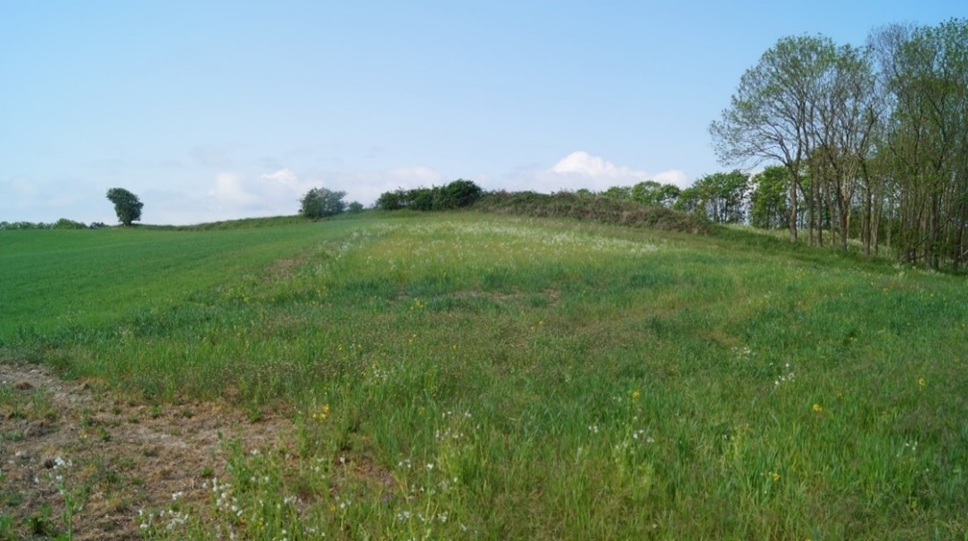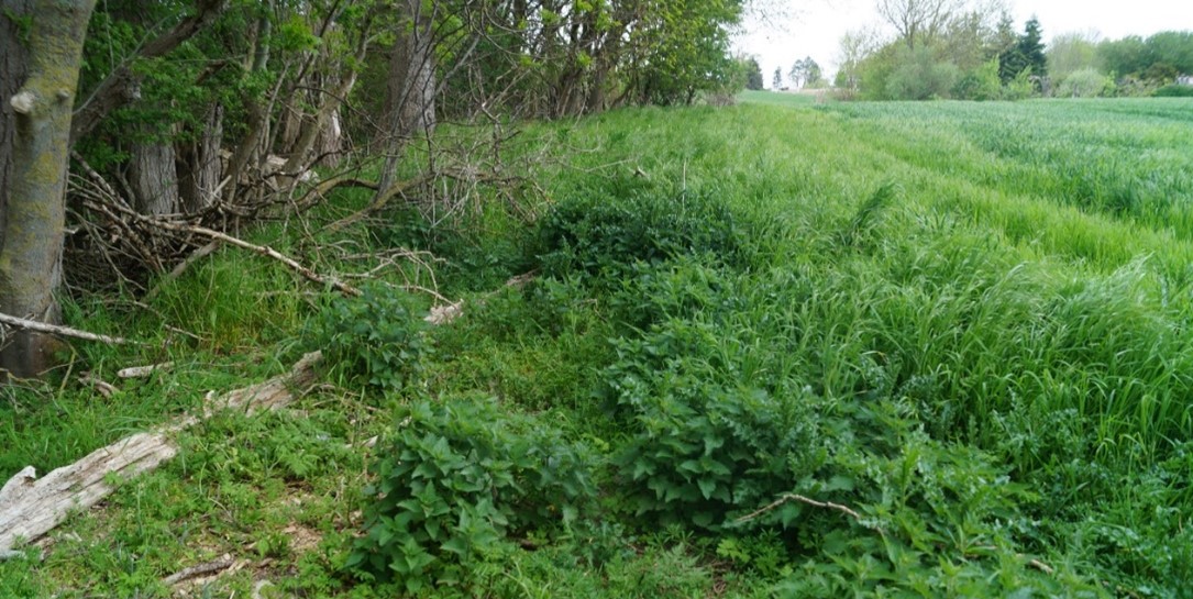 Ukurant og næringsfattig hjørne af marken er her taget ud til brak og giver en gevinst for både diget og læhegnet i baggrunden.