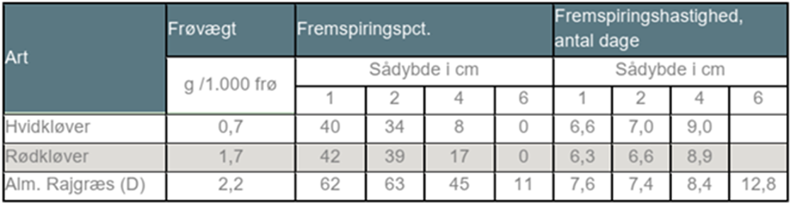 Kløvergræs skal sås i en sådybde på 1 cm, hvilket i øvrigt også gælder for blandinger med lucerne. Herunder behandles kløver og lucerne under en fællesbetegnelse, da mange af kriterierne går igen. Desværre ser vi ofte, at sådybden ender med at blive for stor, da man ved optimal sådybde kan opleve at se græsfrø ligge ovenpå jorden, og derfor skruer lidt ekstra på dybden. Af græsfrøene er det især kløveren, der er følsom overfor for dyb-såning, hvilket også ses i tabel 1. Her ses det tydeligt, at især hvidkløver er følsom overfor sådybden og fremspiringsprocenten forværres hurtigt i takt med stigende sådybde.