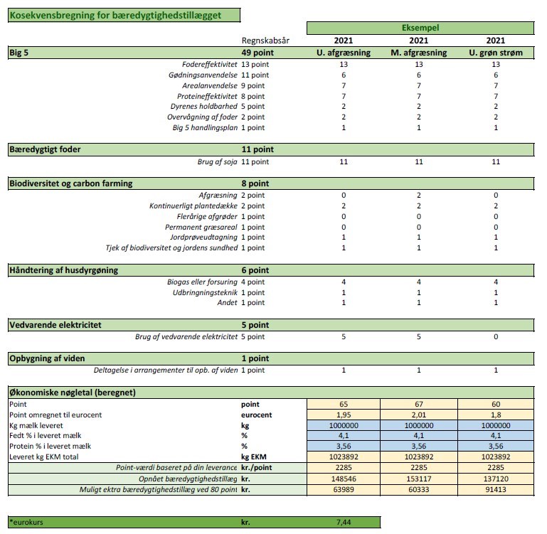 Eksemplet gør sig gældende for en bedrift som i regnskabsåret 2021 har leveret 1.000.000 kg mælk med en fedt% på 4,10 kg protein% på 3,56 (1.023.892 kg EKM). Med den aktuelle leverance har hvert point en værdi af 2.285 kr. I scenariet uden afgræsning, opnås 65 point, hvilket giver et opnået bærdygtighedstillæg på 148.546 kr. I scenariet med afgræsning opnås 67 point og 153.117 kr. i bæredygtighedstillæg. I scenariet uden grøn strøm opnås 60 point og 137.120 kr. i bæredygtighedstillæg. Ved at have en aftale på grøn strøm kan denne bedrift hente 11.425 kr. i ekstra tillæg, hvilket også giver et godt beregningsgrundlag ift. hvad den grønne strøm så må koste, når der skal tegnes kontrakt. Ligeledes kan der ved afgræsning hentes 2 point, svarende til 4570 kr. i ekstra tillæg på denne bedrift. Dertil skal der regnes på om afgræsning kan lade sig gøre logistikmæssigt og om det ekstra tillæg er nok til at betale indhegning, muligt tab af mælkeydelse osv.