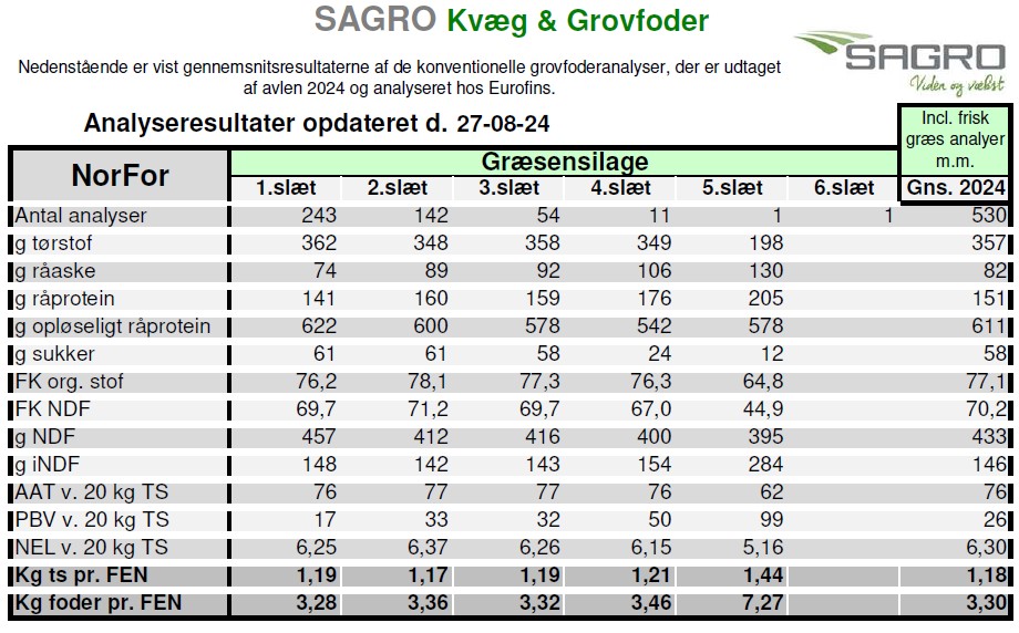 Indtil videre er der taget 530 analyser af græs i SAGRO-regi. Prøverne fordeler sig over 5 slæt pt. med kun 1 prøve af 5. slæt. Sæsonen er endnu ikke slut og vi forventer at tage mange flere prøver endnu.