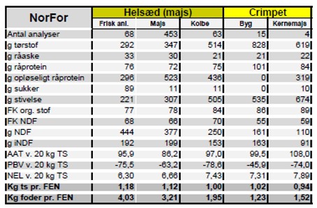 NorFor har opdateret samtlige fodermidler per 27. oktober 2021. Derfor er energiindholdet i især majs og andre højværdiafgrøder steget markant. Med de høje priser på stivelse kan det være en fin strategi at lade nogle hektar majs stå til kolbe-, eller kernemajs. I det nederste billede ses det, at kernemajs bidrager med mere stivelse og energi end byg.