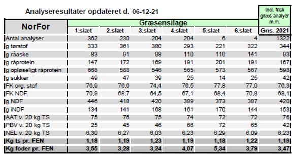 I 2021 var vejret ikke helt med os og 1. slæt gik hos nogen i stængel. Det gav udslag på mere NDF og lavere fordøjelighed af NDF og organisk stof, og altså mindre energirig og hos nogen nærmest kasseret til kviegræs.