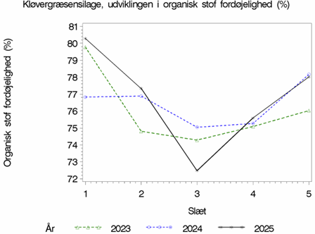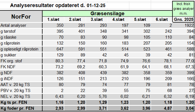 Generelt set har tørstofindholdet på tværs af alle slæt været højt i 2025 og er i gennemsnit 2,5 %-enheder højere end i 2024. Det er især 1. og 2. slæt som blev tørrere i år. Proteinindholdet er stort set på samme niveau som i 2024, dog er opløseligheden højere i år fordi fordøjeligheden af græsset på tværs af slættene er bedre. I gennemsnit er der 18 gram mindre NDF i græsset i år og samtidig er der i gennemsnit 24 gram mere sukker i græsset. Den kombination kan godt være årsagen til, at det ikke er gået helt problemfrit med opstart i ny græs. Især for de besætninger, hvor lagrene 2024 var i bund og der kun var 1. slæt 2025 til rådighed i en periode.