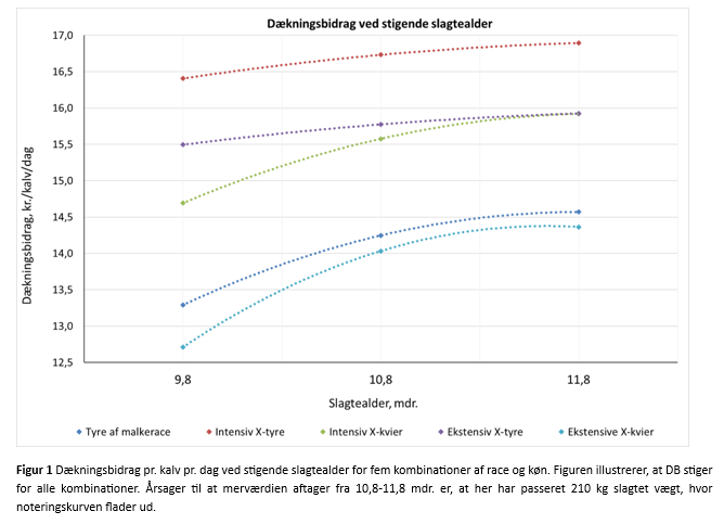 Nye beregninger viser, at øget slagtealder i dag kan forbedre dækningsbidraget i slagtekalveproduktionen, illustreret på figur 1. Når slagtealderen fx øges fra 9,8 til 10,8 måneder, stiger DB pr. kalv og pr. stiplads – selvom der produceres færre kalve og foderforbruget pr. kalv er højere. Forklaringen er højere slagtevægt, bedre slagteform og en mere gunstig afregning, især frem til 210 kg slagtet vægt. Effekten ses på tværs af race og køn, men er størst for malkeracetyre og X-kvier.