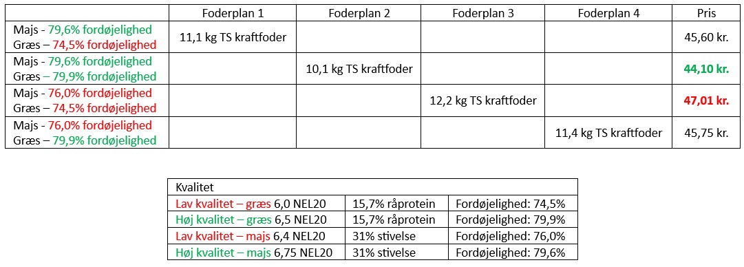 Som det ses i nedenstående tabel, så er foderplan 2, med de bedste grovfoderkvaliteter, også den plan der indeholder mindst kraftfoder. I modsætning er foderplan 3, med de laveste kvaliteter, den foderplan med den højeste mængde kraftfoder. Det betyder naturligvis noget for prisen på rationen og for den mængde grovfoder vi kan få igennem vores køer. I foderplan 2 er det 60,3% mens niveauet i foderplan 3 er helt nede på 53,1%.