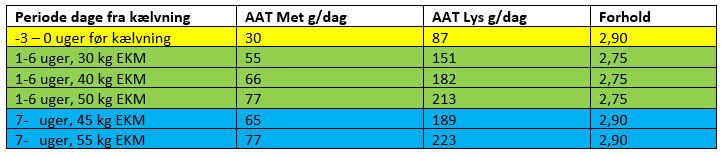 Nedenfor ses et bud på hvordan tildeling af methionin og lysin kunne se ud i DMS: baseret på ydelse, udenlandsk litteratur og en simpel tilpasning i DMS. I starten af laktationen er der mere behov for methionin, hvorfor forholdet bør falde. Tildeling kan ske via kraftfoder eller iblandet mineralerne.