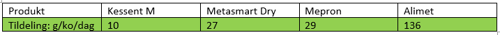 Der er mange produkter på markedet og der er forskel på forsøgsresultater mellem produkter og hvad koen får ud af det enkelte produkt. Nedenfor ses en sammenligning mellem 4 produkter og den nødvendige tildeling i gram for at koen har 6 gram methionin tilgængeligt i blodet for mælkeproduktion: