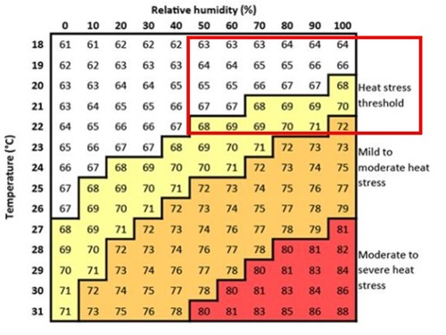 Et godt redskab til overvågning af varmestress er den såkaldte THI skala (Temperature Humidity Index), som med fordel kan hænge i staldkontoret. Her kan man bl.a. se at ved 25 grader og en luftfugtighed på 50 % er der risiko for mild varmestress og ved en temperatur på 28 grader og en luftfugtighed på 80 % er der risiko for alvorlig varmestress.