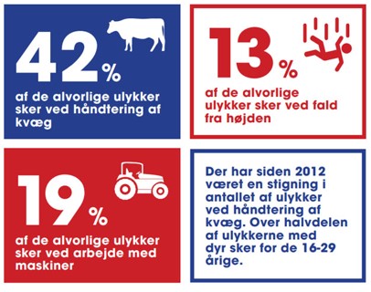Landbruget er fortsat et af de erhverv hvor der sker flest, alvorlige, arbejdsulykker. 42% af disse alvorlige arbejdsulykker, sker ved håndtering af kvæg. 19% af de alvorlige arbejdsulykker sker ved arbejde med maskiner. Og 13% af de alvorlige arbejdsulykker i landbruget sker ved fald fra højden.