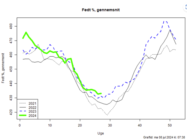 I nedenstående figur vises helt friske data på fedtprocentens udvikling hen over årene. Den grønne kurve viser præcis det samme forløb som de forgangne år, og derfor kan vi formentlig også regne med at vi i denne sommer nu har passeret bunden.