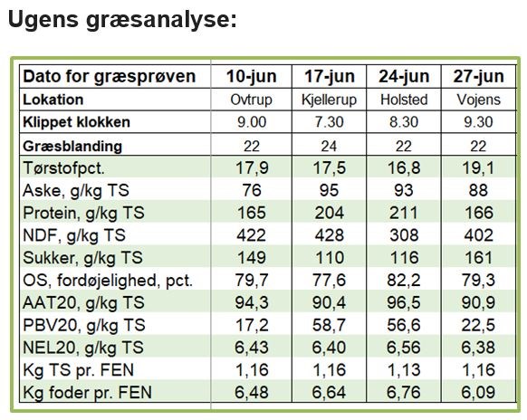 Citat: Græsprøven i denne uge er udtaget ved Vojens kl. 9.30. Analysen viser et lavt proteinindhold og en middel fordøjelighed på godt 79 %.