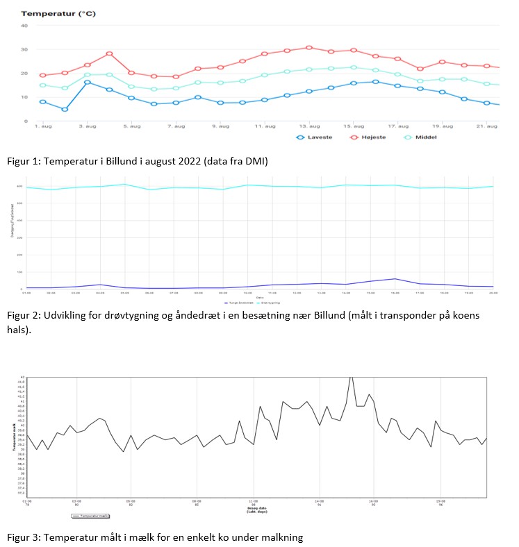 I data fra robotter er det muligt at få indblik i hvordan køerne reagerede på den varme periode i august. I nedenstående figur 1 er vist højeste temperatur (rød kurve) i august måned i Billund området. For den samme periode er der i figur 2 vist data fra en besætning i samme område. Her fremgår niveau for drøvtygning og åndedræt. Endelig er der i figur 3 vist temperaturdata målt i mælken under malkning for en enkelt ko igennem samme periode i august.