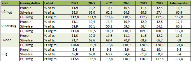 Analyseresultaterne i tabellen er gennemsnitstal på landsplan. Da der ses store udsving i kornets næringsstof-indhold regionalt og lokalt, anbefaler vi at få udtaget og analyseret en prøve af eget korn til brug i jeres foderoptimeringer. Når proteinindholdet i korn stiger, kan der spares lidt på forbruget af jeres proteinrige råvare eller tilskudsblanding.