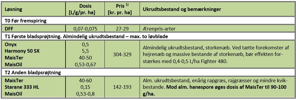 Planlægges der roer, ærter eller hestebønner efter majsen, må der i stedet sættes en løsning sammen af de øvrige godkendte midler incl. Onyx. VI har en sådan løsning med i vores standard-sprøjteforslag; se tabel 3.