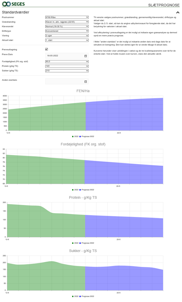 Analyseresultaterne fra den 16. maj har jeg indtastet i slætgræsprognosen. Resultatet ses i figur 1 nedenfor.