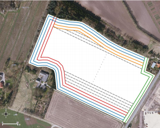 3) Grå linjer (stiplede): Som tredje del, er det nu muligt at påbegynde skårlægning ad de gråstiplede linjer startende fra syd (ved grusvejen).