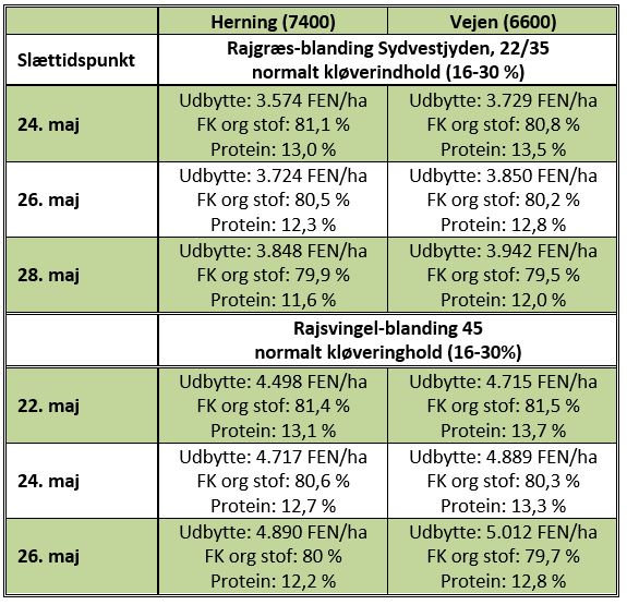 Tabel 2 Slætgræsprognosen for to græsblandinger på to lokaliteter. (Kilde: SEGES)