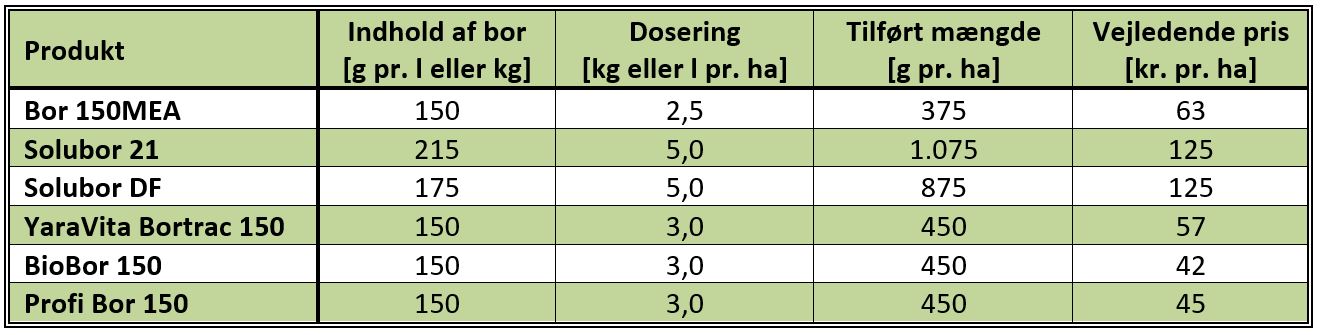 Tabel 2 Vejledende dosis af borprodukter (Kilde: SEGES, Vejledning i planteværn 2022, side 138)