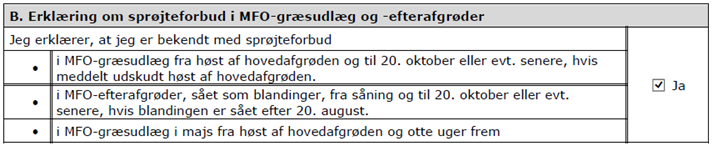 Figur 2 Udklip fra fællesskemaet 2022, med afkrydsning for at sprøjteforbuddet i MFO-græsudlæg overholdes.