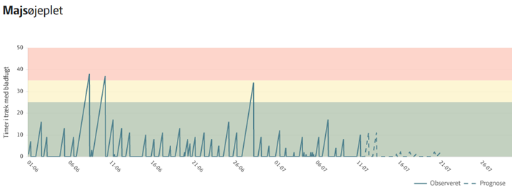 Figur 1 Antal hændelser med bladfugt – og varighed – fra den 1. juni til 11. juli i majsafgrøde ved Bramming (Kilde: CropManager, SEGES)
