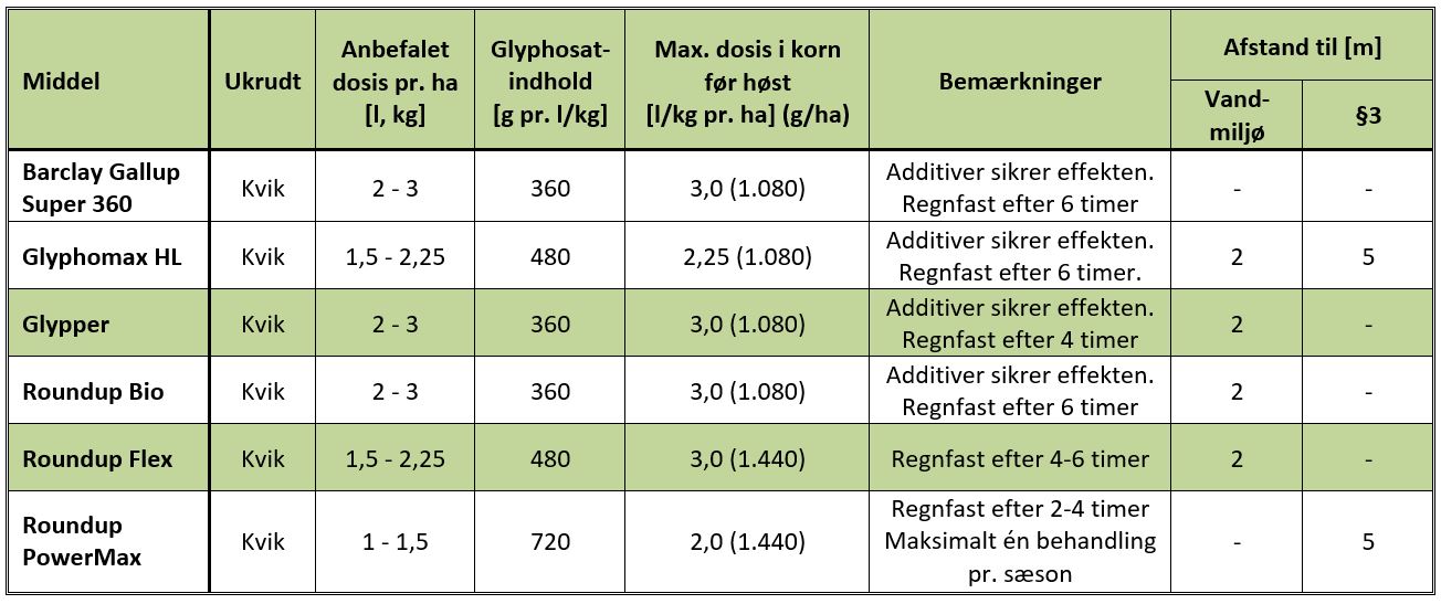 Tabel 1 Løsningsforslag til bekæmpelse af ukrudt før høst. Det er vigtigt at medtage relevante additiver (se tekst). Doseringen mod kvik afhænger af tætheden af kvik.