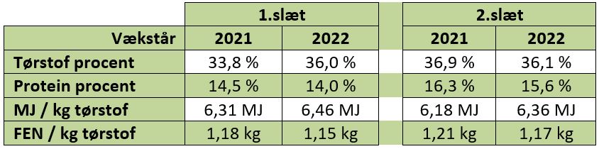 Tabel 2 Analyser af første og andet slæt