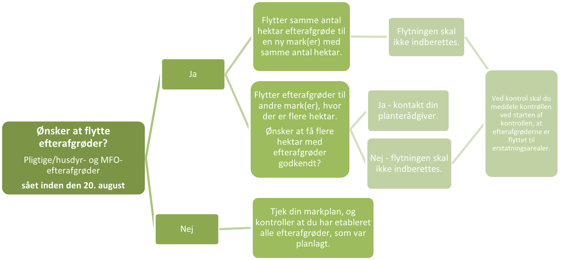 Ændringer i efterafgrødearealer skal ofte indberettes. Ved flytning af efterafgrøder, hvor ændring ikke skal indberettes, skal du ved kontrol være særlig opmærksom. Ved kontrollens start SKAL kontrolløren orienteres om, at du har sået efterafgrøder på erstatningsarealer, og du skal angive, hvilke arealer der anvendes i stedet.