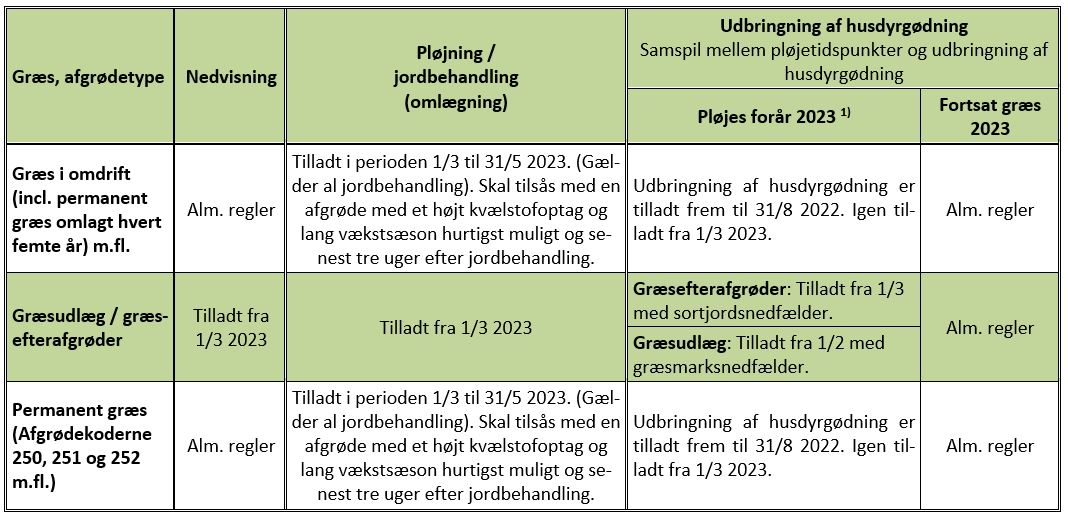"Græs" omfatter såvel omdriftsarealer med rent græs, kløvergræs og lucernegræs med mindre end 50 % kløver/lucerne og frøgræs som permanente græsarealer. Græsefterafgrøder skal være udlagt i silomajs, i korn til modenhed, helsæd eller grønkorn. Græsudlæg må indeholde cikorie og op til 50 % kløver/lucerne. Græsudlæg og –efterafgrøder skal være sået senest 1. august. Græsefterafgrøderne må tidligst nedpløjes (destrueres) eller nedvisnes 1. marts 2023.