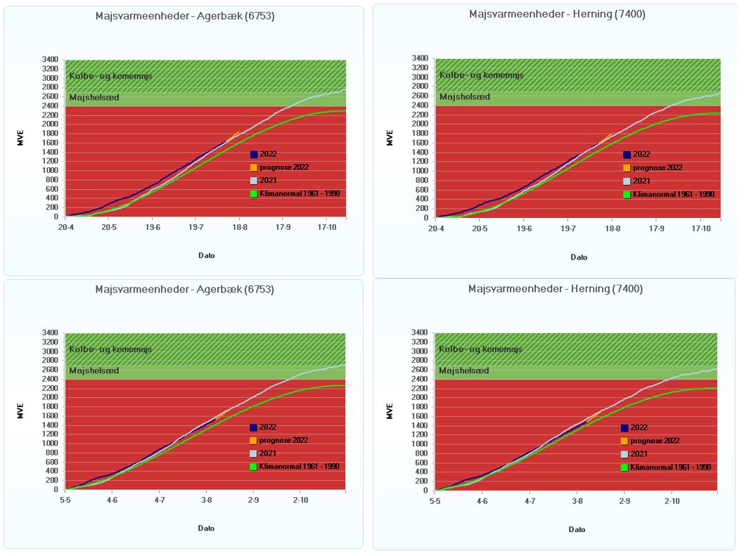 De akkumulerede majsvarmeenheder (MVE) for majs sået henholdsvis den 20. april og den 5. maj på lokaliteterne Agerbæk og Herning viser, at årets MVE fortsat følger niveauet for 2021 men med en stigende tendens. For majs, som er sået den 5. maj, mangler der ganske få MVE for at være på niveau med 2021 på samme tidspunkt. Ved en visuel bedømmelse i markerne, synes afgrøderne dog endnu ikke at være så langt fremme som i 2021 på samme tidspunkt.