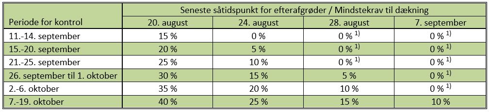 I tabel 1 er Landbrugsstyrelsens krav til efterafgrødernes overfladedækning vist. Hvis du vurderer, at efterafgrøderne ikke kan nå de krævede mål om overfladedækning i de givne perioder, er du nødt til at efterså. Dækningskravene i tabel 1 gælder for alle efterafgrødetyper – pligtige, husdyr, MFO og målrettede. Kontrollen af efterafgrødernes dækning foregår i perioden frem til 20. oktober, for efterafgrøder etableret i majs dog noget længere pga. den senere høst. Ligeledes gælder dækningskravene også for efterafgrøder til opfyldelse af 80%-kravet på kvæg-undtagelsesbrug, men de bliver dog først kontrolleret i perioden januar-februar 2023.