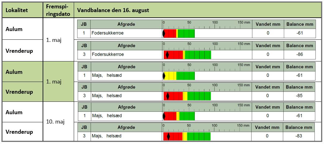 Af den aktuelle vandbalance for lokaliteterne Aulum, JB 1, og Vrenderup, JB 3, ses det tydeligt, at på de grovsandede og grove, lerblandede sandjorde er den plantetilgængelig vandmængde helt opbrugt. For grovsandede jorde, JB 1, er den plantetilgængelige vandmængde ca. 60 mm, mens de grove, lerblandede sandjorde, JB 3, holder godt 90 mm plantetilgængelige vand i rodzonen. Vandmanglen er nu så stor, at det går ud over afgrødernes produktion.