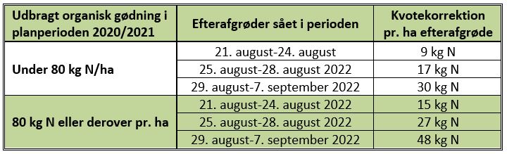 I modsætning til andre år, hvor nedbøren har sat en stopper for høsten og dermed også for etablering af efterafgrøder, ser det lysere ud i år på denne front. Opstår der på trods heraf et behov for senere etablering af efterafgrøder, er kvælstofkorrektion i N-kvoten 2022/23 heldigvis lavere end tidligere. For en ejendom, som anvender mere end 80 kg organisk kvælstof pr. ha, og hvor efterafgrøden sås efter 28. august, medfører det i år et kvotetræk på 48 kg N/ha, mens det sidste år ville have resultere i et kvotetræk på 65 kg N/ha.