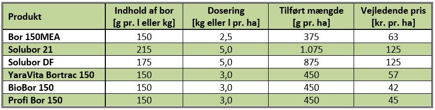 Tabel 1 Vejledende dosis af borprodukter (Kilde: SEGES, Vejledning i planteværn 2022, side 138)