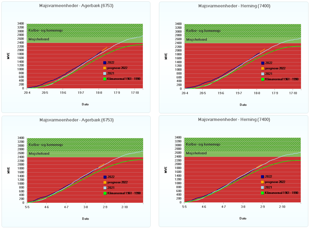 Figur 1 Majsvarmeenheder (MVE) for majs i Agerbæk og Herning, sået 20. april henholdsvis 5. maj. (Kilde: SEGES)