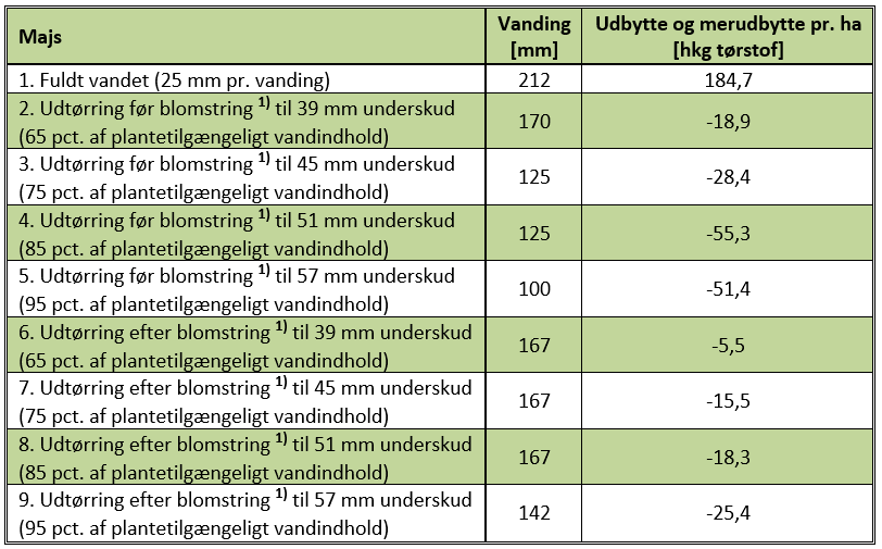 Tabel 1 Vanding af majs, 2014, ét overdækket forsøg (Kilde: Oversigten over Landsforsøgene 2014, s. 410)