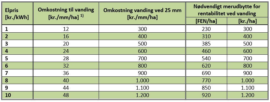 1) Elforbruget til vanding forudsættes at være 4,28 kWh/mm/ha. Fast nettarif på 0,30 kr./kWh