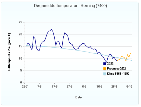 For normalt udviklede afgrøder vil tørstofindholdet på nuværende tidspunkt stige med gennemsnitligt 2,5 procentpoint pr. uge. Så længe mere end en tredjedel af bladmassen er grøn, vil der fortsat være tilvækst og stivelsesindlejring i kernerne. Når mere end to tredjedele af bladmassen er visnet pga. afmodning, tørke eller nattefrost, sker der ikke yderligere vækst, og afgrøden bør høstes for at undgå udbyttetab. Overordnet set kan vi i en grøn afgrøde forvente nettotilvækst så længe, døgnmiddeltemperaturen er over 10 °C. Du kan forvente, at døgnmiddeltemperaturen falder til under 10 °C i første halvdel af oktober.