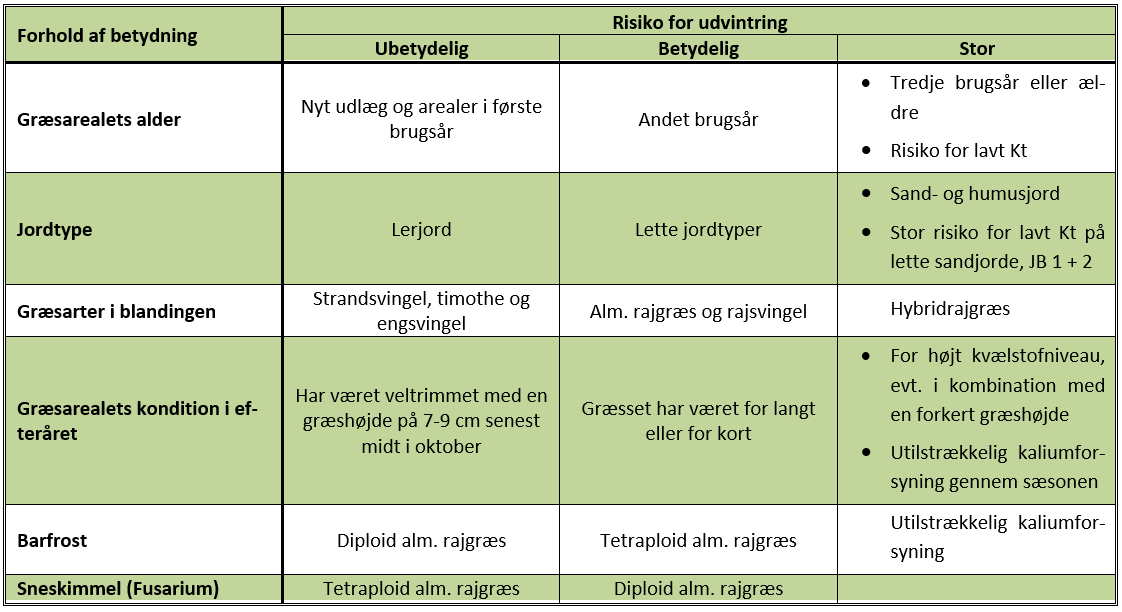 Nedenstående skema, som du kan benytte til risikovurdering for udvintring i græsmarken, er udarbejdet og tilrettet med udgangspunkt i SEGES' anbefalinger.