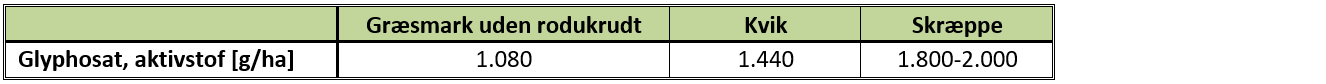 Tabel 2 Dosis af glyphosat (og produkter) ved nedvisning af græs og rodukrudt i efteråret.