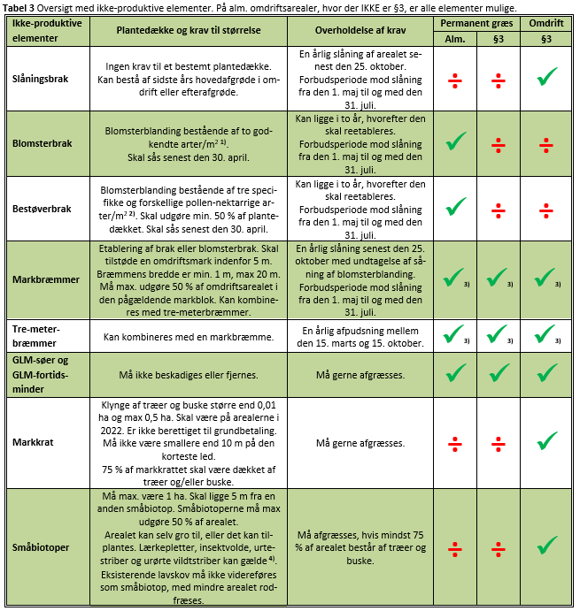 Afgræsning og slæt anses som produktion, hvorfor der hverken må afgræsses eller tages slæt på ikke-produktive arealer. Der er dog visse undtagelser ved afgræsning, som kan ses i nedenstående tabel.