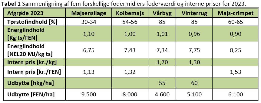 Af tabellen ovenfor kan man vurdere, hvad der passer bedst på den enkelte bedrift i forhold til aktuelle udbytte og dyrkningsomkostninger. Bemærk, at kvaliteten af kolbemajs ligger på niveau med foderbyg.