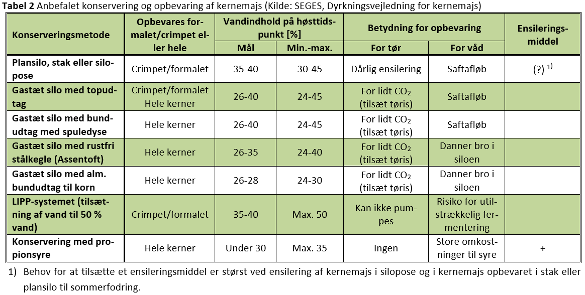 Ved at vælge kernemajs får du et meget koncentreret foder, der ved korrekt tilsætning af syre og opbevaring kan opfodres umiddelbart efter høst. Stivelsen i kernerne er findelt og derved lette for køerne at udnytte. Se alternative muligheder for konservering i tabel 2.