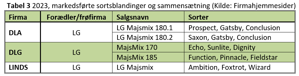 Flere firmaer markedsfører og sælger sortsblandinger i majs. Sortsblandinger kendes mest fra vårbyg, men findes også i vinterhvede, og nu også i majs. Fordelen ved sortsblandinger i majs er, at de giver en større stabilitet og sikkerhed for kvalitet og udbytte, hvis de er sammensat under hensyntagen til de enkelte sorters forskellige dyrkningsegenskaber, herunder tidlighed, sygdomsmodtagelighed og i det hele taget evne til at klare sig under forskellige udfordringer i vækstsæsonen. Sortsblandinger anbefales udelukkende til helsæd. Til den kommende sæson markedsføres flere sortsblandinger.