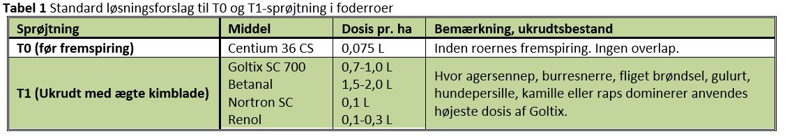 Første sprøjtning efter roernes fremspiring (T1-sprøjtning) er den vigtigste i sæsonen. Denne SKAL lykkes, hvis du skal kunne holde roemarken ren for ukrudt. Sprøjtningen udføres helt klassisk med Goltix SC 700, Betanal, Nortron SC samt penetreringsolie. Safari 50 WG anvendes kun undtagelsesvist ved T0-sprøjtningen, men ved fremspiring af bl.a. korsblomstret ukrudt, hanekro, kamille og storkenæb, kan det være aktuelt at supplere med Safari 50 WG. T1 sprøjtningen udføres på ukrudtets ægte kimbladsstadium – dvs. når løvbladene kun kan anes som en lille knop. Forslag til midler og dosis fremgår af tabel 1.