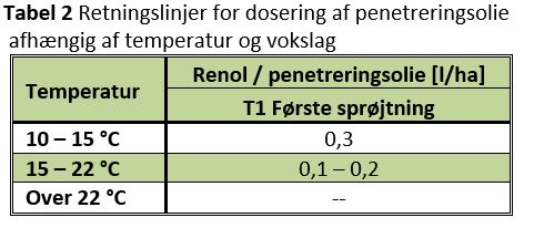 Penetreringsolie er vigtig for effekten af bladmidlerne, men hvis dosis er for høj, kan det give svidninger af roerne. Dosis af penetreringsolie kan justeres efter forholdene som angivet i tabel 2. Mange har større mængder MaisOil på lager, fordi vi ikke i alle tilfælde anvender så høj en dosis, som firmaet anbefaler. MaisOil er en rigtig god penetreringsolie, og den kan erstatte enhver anden olie på markedet.