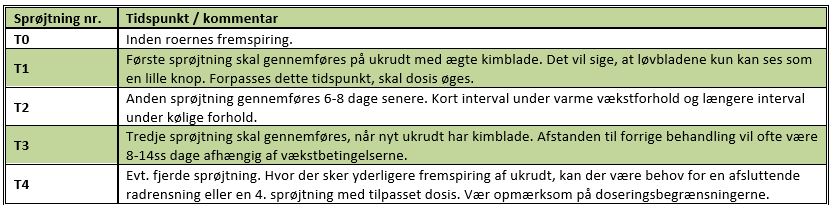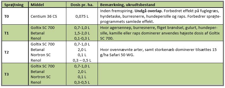 Ukrudtsbekæmpelsen tager udgangspunkt i sprøjteforslagene i tabel 4. Hvor der kun forekommer en "almindelig" ukrudtsbestand uden svært-bekæmpelige arter, kan du få et tilfredsstillende resultat ved at følge nedenstående, men ofte vil der være hårdføre ukrudtsarter, der kræver højere dosis, eller måske driller vejret, så timingen ikke bliver perfekt. I disse tilfælde må tankblanding og timing af sprøjtningerne justeres. Ved sådanne udfordringer må du rådføre dig med din planterådgiver. For sprøjtetidspunkt henvises til tabel 1.